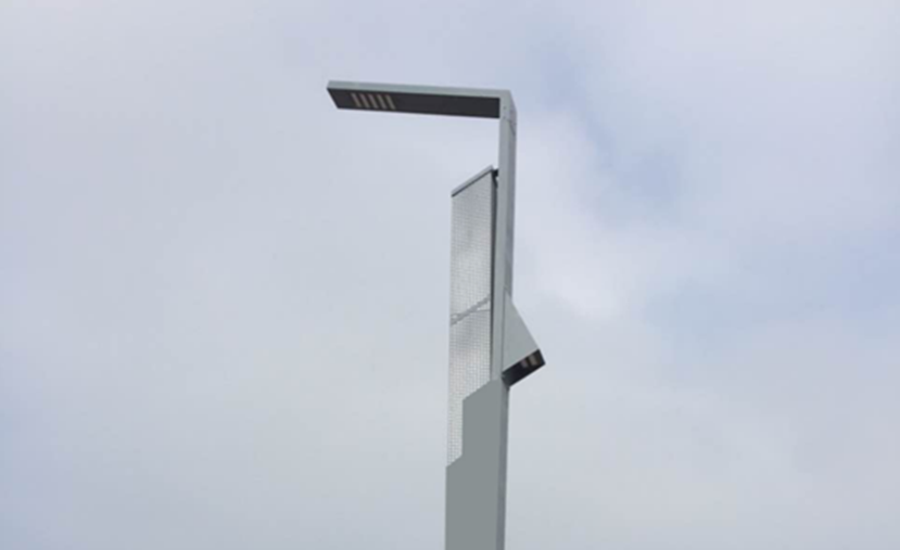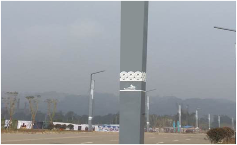 燈體上部的鏤空部分隱藏同濟元素的帆船圖案,寓意同舟共濟;夜間,網(wǎng)格部分七彩漸變發(fā)光,呈現(xiàn)帆船圖案。