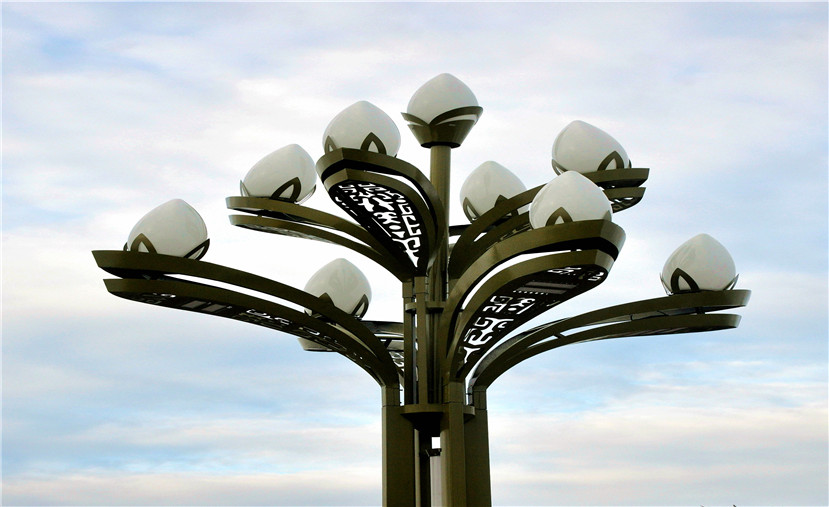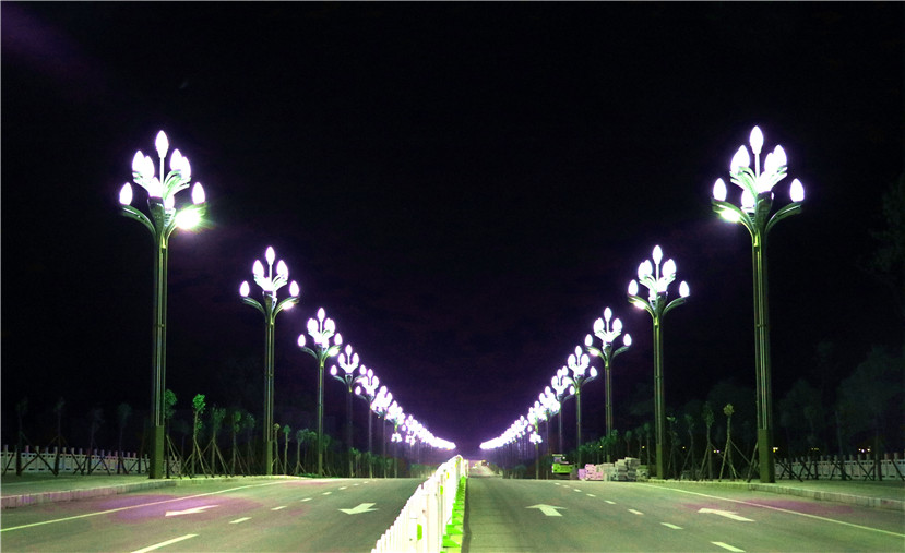八叉九火玉蘭燈,燈高16米,燈桿呈古銅色,外觀造型大氣而有質(zhì)感,桿體內(nèi)側(cè)安裝LED節(jié)日氛圍燈條;光源采用全LED光源,替代傳統(tǒng)鈉和節(jié)能燈光源,道路照度均勻度和環(huán)境進(jìn)一步提升。