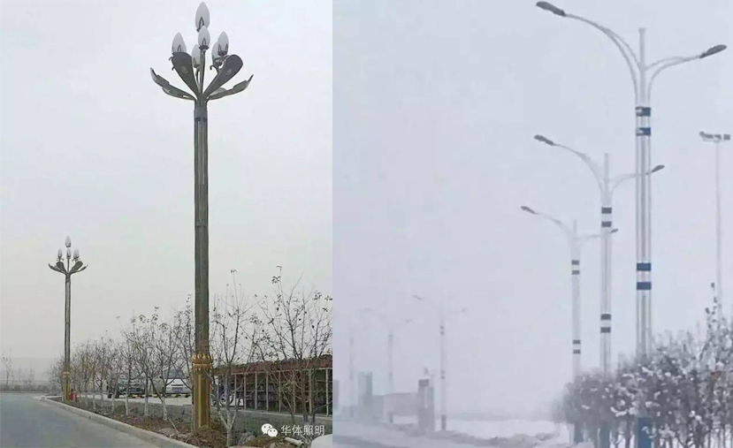 12月的石城已是零下10度左右,大雪紛飛,銀裝素裹。調(diào)皮的雪花輕輕地落在含笑燈上,一夜之間,含笑像是穿上了一件雪白的禮服,高雅端莊。遠(yuǎn)看好似一位優(yōu)雅的女子,飽含深情地望著遠(yuǎn)方,像是在等待遠(yuǎn)歸的愛(ài)人。10米雙臂路燈,以藍(lán)白為主要色調(diào),給人以干凈、利落之感。燈桿中部配置LED七彩燈條,為這雪白的王國(guó)增添五彩繽紛的樂(lè)趣。