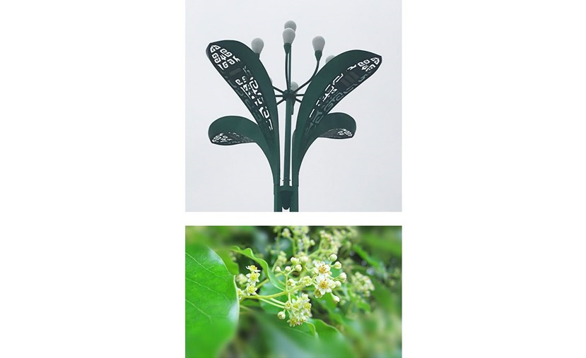 “香樟”景觀燈,根據(jù)祁陽縣縣樹香樟的形狀進(jìn)行抽象設(shè)計(jì),通過燈臂部分展開的樹葉和燈桿頂部即將盛開的香樟樹花朵相結(jié)合,讓路燈集道路照明和景觀裝飾照明于一體,提升祁陽夜間城市照明形象。