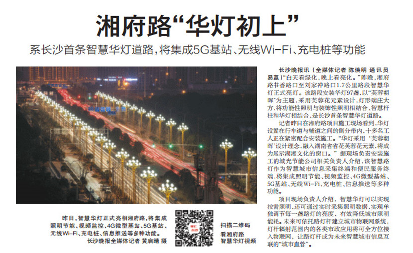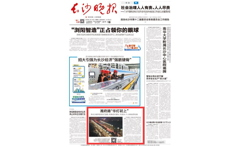 “芙蓉朝暉”智慧路燈建成亮燈后,得到了湖南當(dāng)?shù)毓俜矫襟w的重點(diǎn)關(guān)注和報(bào)道。1月18日,長(zhǎng)沙晚報(bào)在頭版重點(diǎn)報(bào)道湘府路上這條長(zhǎng)沙市首條智慧路燈示范段。