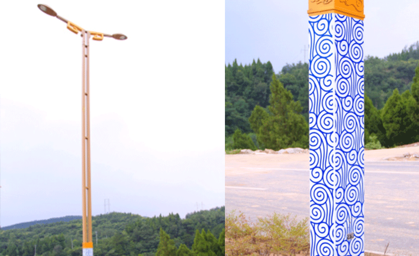 該款燈底座將帶有中國元素的祥云紋運用于燈具上,呈現(xiàn)藍白色相間,極具“中國風”特色,寓意祥瑞、民安。燈桿與底座的連接部分,金色的卷云紋熠熠生輝,與底座的藍色對比鮮明,讓人眼前一亮。瓷蓮路完善了城市北環(huán)線,而蜀紋燈則如忠誠的衛(wèi)士,排列有序,在迎接八面來賓的路上,訴說著廣元市古樸濃厚的歷史文化。
